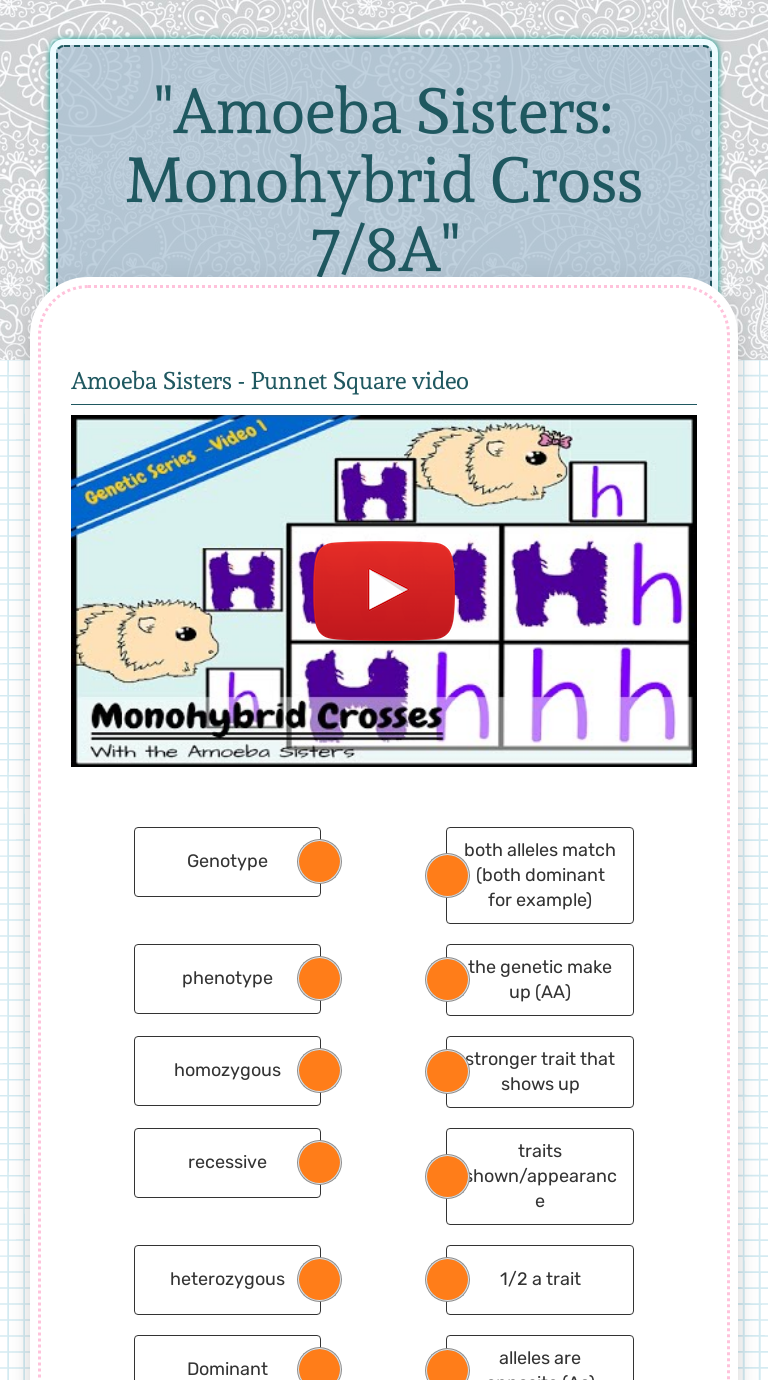 Amoeba Sisters Video Recap Monohybrid Crosses Mendelian Sisters Video Recap Monohybrid Crosses Mendelian Mysterious Fred A Guinea Pig Test Cross There Is A Teacher From Texas Pdf Document from demo.fdocuments.in Start with this video to help you complete the interactive worksheet. In your own words, explain how a person may taste the bitterness of ptc by using the following vocabulary words in your explanation (choose any order): Following in depth, we'll be motivated to amoeba sisters monohybrid crosses answer key is a different way of taking a look at defining assume the allele h (hair) is dominant to the allele h (hairless) in guinea pigs. Multiple alleles (abo blood types) and punnett squares. Gene 1 has two different variations, or alleles the word chromatid is only used to refer to each copy of the duplicated. Amoeba sisters scientific method this is for a video found on youtube. / learn how to set up and solve a genetic problem involving multiple alleles using abo blood types as an example!. Amoeba sisters video recap introduction to cells answer.